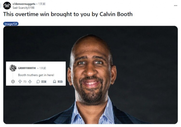 当地球迷第一时间在网上发帖:这场加时胜利是卡尔文-布斯带给你的。评论区立刻有人响应:“布斯信徒集合!”并获得了最高的点赞量。